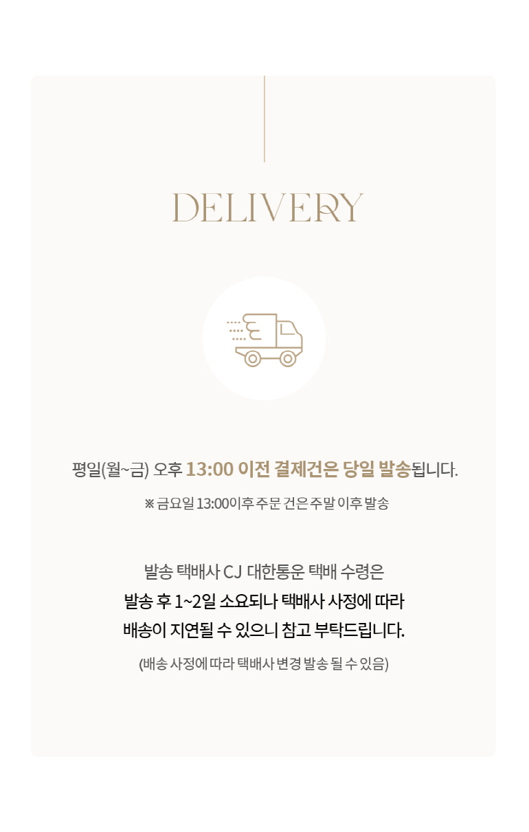• ÁÖ¹®µÈ »óǰÀº Á¦Ç°°ú ¼ö·®¿¡ µû¶ó ´Ù¼Ò Â÷À̰¡ ÀÖÀ¸³ª, º¸Åë ¹ßÁÖ ÀϷκÎÅÍ 3~7ÀÏ À̳» ¹è¼ÛÀ» ¿øÄ¢À¸·Î ÇÕ´Ï´Ù. (µµ¼­»ê°£Áö¿ªÀÇ °æ¿ì¿¡´Â 1~2ÀÏÀÌ Ãß°¡·Î ¼Ò¿äµÉ ¼ö ÀÖ½À´Ï´Ù.)